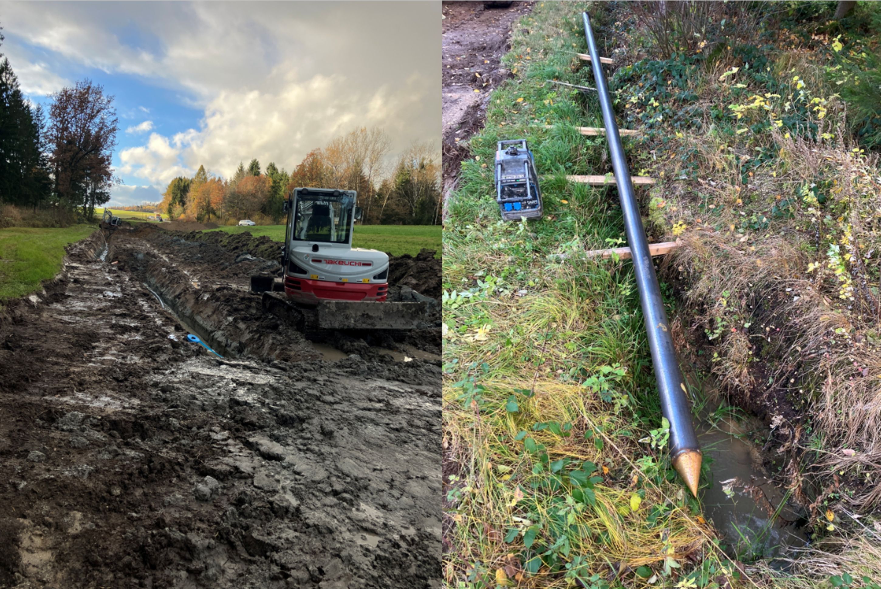 Die Maßnahmen beinhalten zum Einen den Bau einer Wasserleitung mit einem Durchmesser von 2,5“ (ca. 80mm) über eine Länge von 600 m und zum Anderen die Sanierung der Quellfassung samt der Versetzung eines neuen Quellsammelschachtes. Momentan sind die Grabungsarbeiten für die Wasserleitung in vollem Gange. Die Querung eines Güterweges konnte mittels eines vom Baudienst eigens konstruierten Stahlrohres mit Spitze und Abschlussplatte aufgrabungsfrei erfolgreich gemeistert werden.