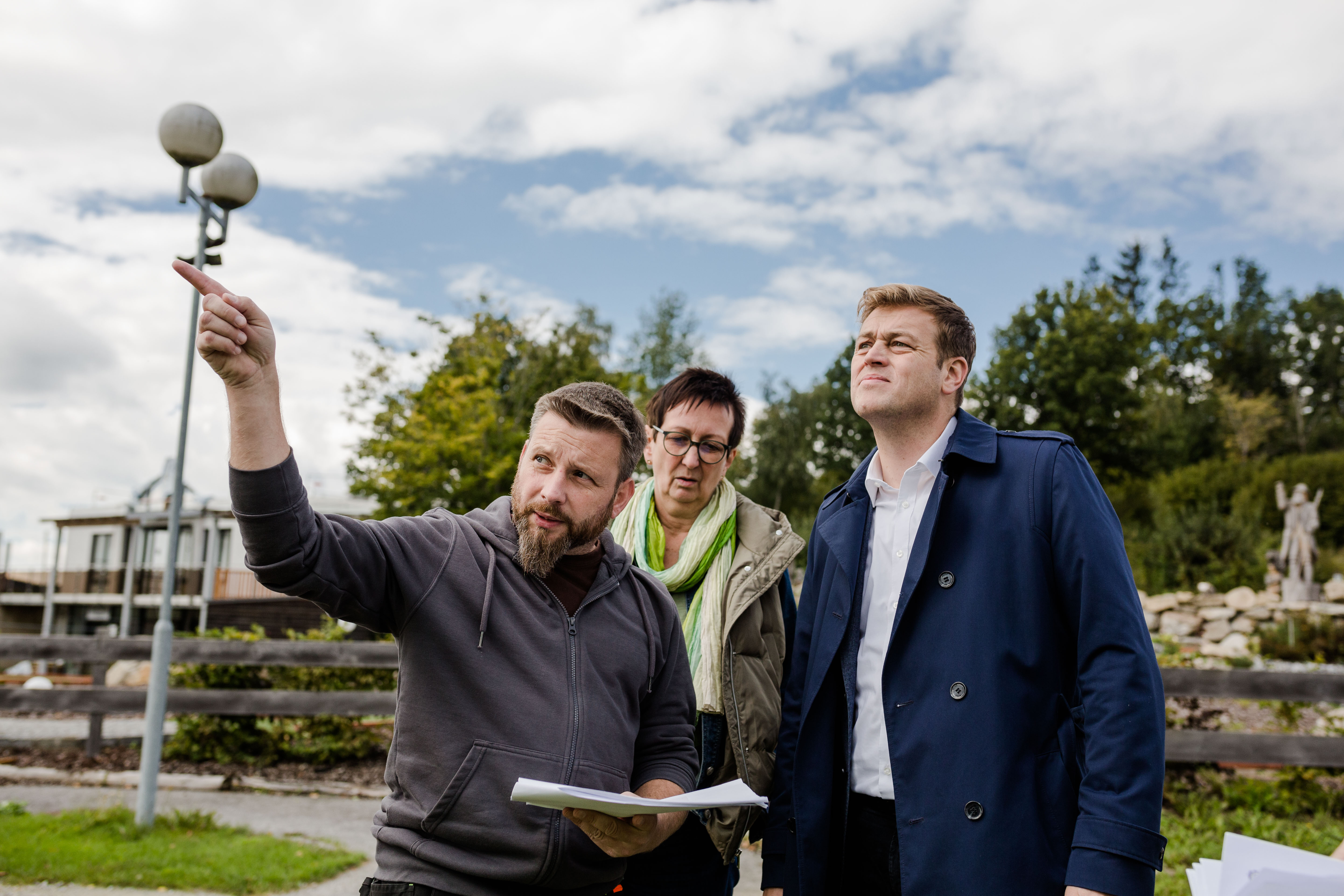 Bildtext: Mario Lang klärt Landtagsabgeordnete Ulrike Schwarz und Umwelt- und Klima-Landesrat Stefan Kaineder über die Dimensionen des geplanten Appartementhotelprojektes in Seitelschlag auf.