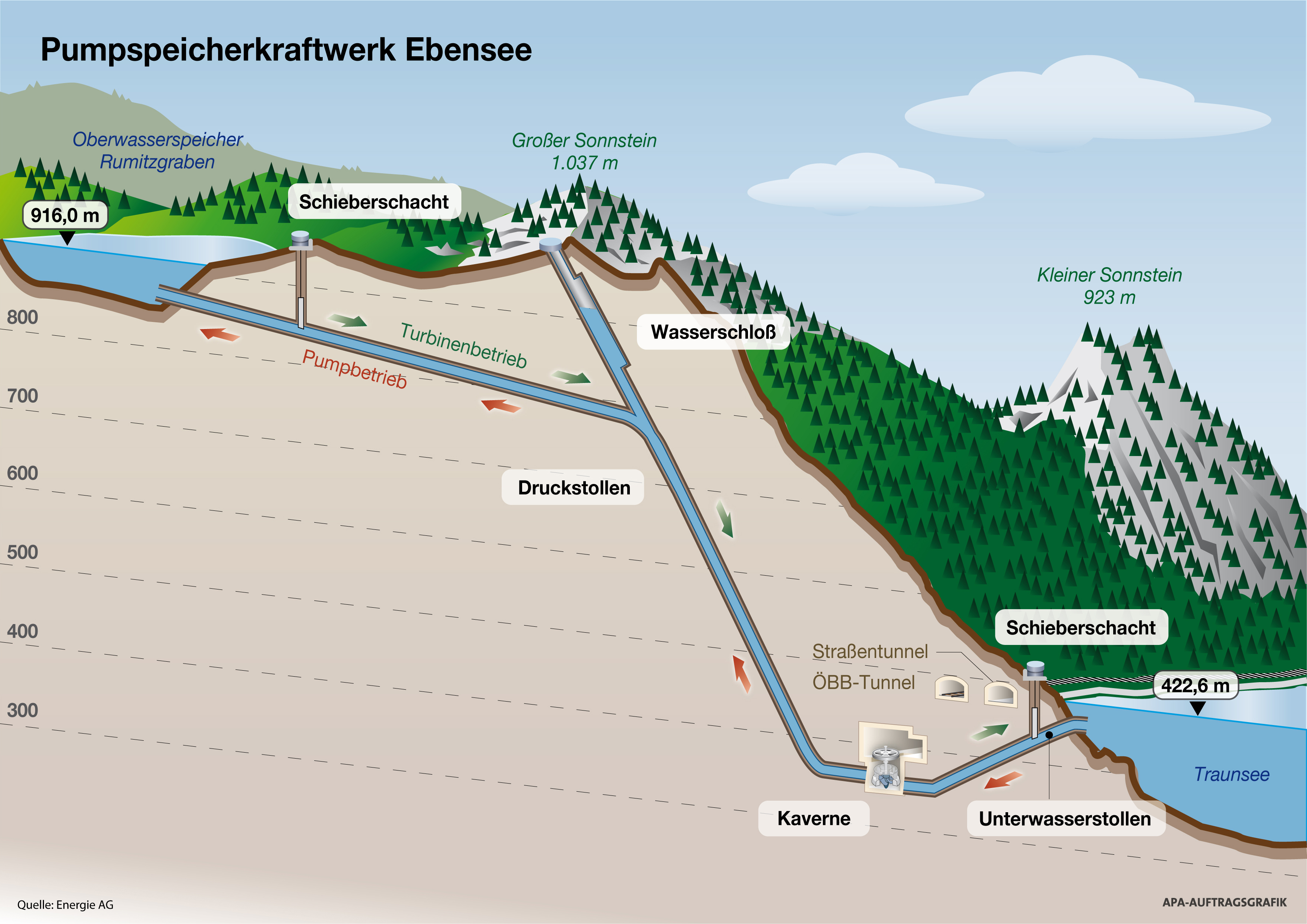 Das Pumpspeicherkraftwerk ist zusätzlich mit einer Pumpe ausgestattet, um bei überschüssigem Strom im Netz Wasser aus einem Unterwasserbecken in das Oberwasserbecken bzw. in den Stausee zu pumpen, so wird elektrische Energie wieder in potentielle Energie umgewandelt.