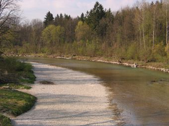 - Dynamisch gewundener Flusstyp im Übergang von den Alpen zum Alpenvorland (zw. Grünau u. Mühltal)